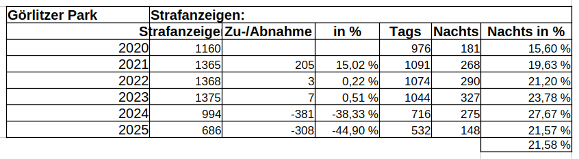 - Der Großteil der Delikte am kbO Görlitzer Park/Wrangelkiez findet (seit Jahren) außerhalb des Görlitzer Parks statt! Eine aktuelle Anfrage von Vasili Franco (Grüne) zeigt, dass im Jahr 2025 79% aller Delikte nicht im Görlitzer Park, sondern außerhalb, also im Rest des kbO Görlitzer Park/Wrangelkiez stattfinden (Link leider mit Paywall)