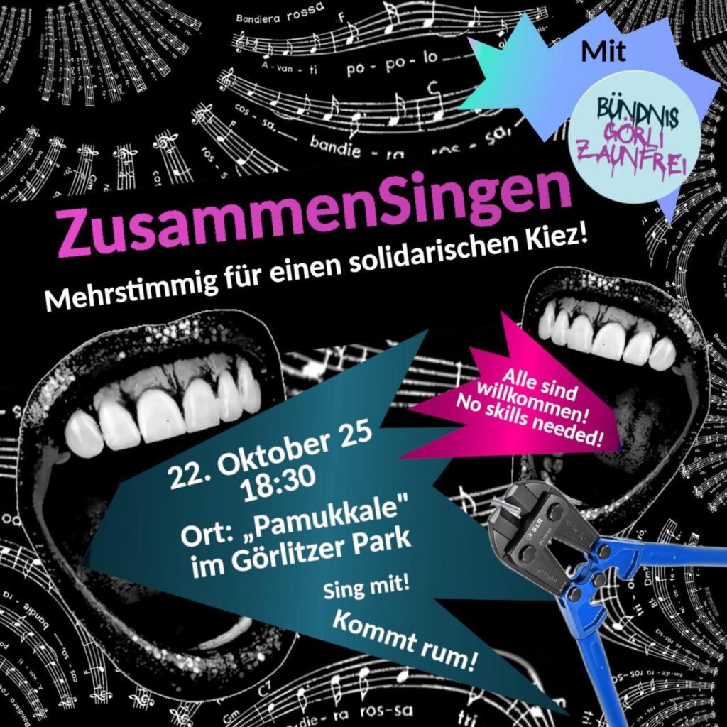 Wir singen Klassiker wie “Solidarity forever” und “Bella Ciao”, myGruni-Hits wie “Glück auf”, “We are the Kiez”, neuere Sachen wie “the day the Nazi died”, Punk und ein paar Antifaschistische Jodler.