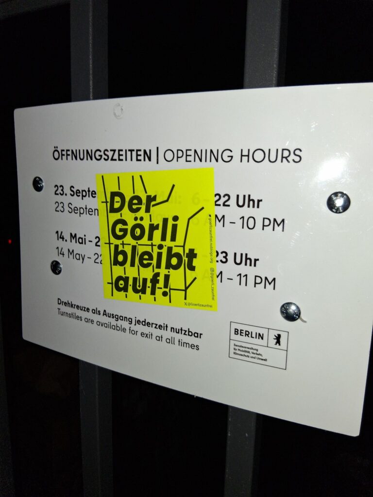 Auch jenseits von Argumenten, Diskussionen und öffentlichen Veranstaltungen scheint der Ärger groß zu sein: immer wieder kommt es zu Sachbeschädigungen an Toren und Zaun und am Abend der ersten Schließung hat anscheinend nicht ein einziges Schloss funktioniert, so dass der Görli nur mit Hilfe von Fahrradschlössern gesperrt werden konnte.